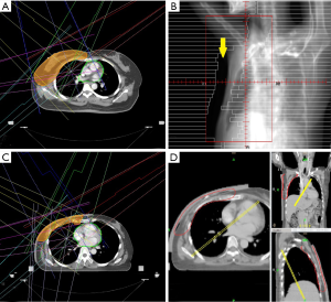 Adjuvant radiotherapy (RT) has played an important role in multimodality treatment of breast cancer. For patients with early stage disease who receive breast conservative surgery (BCS), adjuvant RT to the residual breast tissue improved local control and survival (1). On the other hand, for patients with local advanced stage breast cancer who received mastectomy, adjuvant RT to chest wall and lymph node region reduced recurrent rate and breast cancer specific mortality (2,3).The target volume of RT after mastectomy typically includes ipsilateral chest wall, supraclavicular fossa (SCF), internal mammary lymph nodes (IMLN) and/or axillary lymph nodes (4,5).