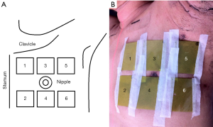 For each patient included, the skin surface of the breast or chest wall was divided into six areas including upper-lateral area, lower-lateral area, upper-central area, lower-central area, upper-medial area and lower-medial area, which were coded as No.1, 2, 3, 4, 5, 6, respectively (Figure 2A,B).