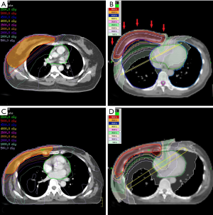 In PMRT group, an IMRT plan consisting of 7 IMRT field directions was designed with 20 mm skin flash (Figure 1C). A 5-mm tissue equivalent bolus was added on patient’s ipsilateral chest wall to ensure the superficial coverage. On the other hand, 10 mm tissue equivalent bolus was added for patient in PMRT group treated with HT. A directional block was also used to restrict the beam angle (Figure 1D).