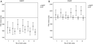 Table 6 showed that IMRT delivered 5% higher dose to the lateral regions than medial and central regions (110.49%, 105.92% and 105.52% of prescribed dose, respectively, P=0.014); while lower skin regions received higher skin dose by IMRT than upper regions did with dose difference less than 3% (108.48% versus 106.14%, P=0.002).