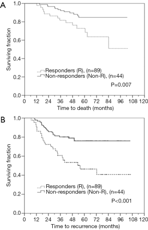 Between the responders and non-responders, OS was 94.5 and 78.2 months (95% CI, 89.2–99.8 and 67.0–89.4, P=0.007), and RFS was 85.5 and 59.9 months (95% CI, 78.3–92.6 and 47.3–72.4, P<0.001), respectively (Figure 3A,B). The time to locoregional recurrence was 56.7 and 48.3 months (responders vs. non-responders, P=0.033). Table 2 presents the multivariate Cox regression analyses of OS and RFS for the entire cohort. The Cox models confirmed the prognostic value of clinically HER2/neu-positive (HR =0.234; 95% CI, 0.074–0.737, P=0.0013), whereas pathologically node-positive patients were associated with poorer OS (HR =7.126; 95% CI, 1.748–29.055, P=0.006). As for RFS, responders (pCR/PR) showed significantly better results (P=0.033). However, pathologically node-positive patients displayed a trend in recurrence (P=0.057). For the non-responder group, multivariate Cox regression analysis of OS was performed and no significant prognostic factors were observed.