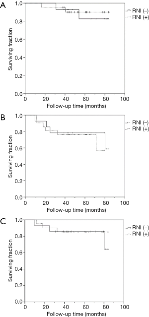 In the subgroup analysis, in order to evaluate the effects of breast + RNI after BCS or chest wall + RNI after mastectomy in patients who presented with cN(+) but converted to ypN0 following NAC, we further investigated the role of adjuvant RNI in cT1-3N1 diseases. In total 29 patients with cT1-3N1 who achieved ypN0 after NAC were selected. Of these 29 patients, 21 patients who underwent BCS or mastectomy and received comprehensive adjuvant radiotherapy (breast + RNI or chest wall + RNI) were in the comprehensive RNI group, while eight patients who had BCS and received adjuvant breast-only irradiation (without RNI) were in the non-RNI group. Moreover, from our database we also collected 6 additional patients with cT1-3N1 disease who became ypN0 after NAC and mastectomy but received no adjuvant radiotherapy. Consequently, there were 14 patients in the non-RNI group. Kaplan-Meier survival curves for comprehensive RNI vs. non-RNI were generated for OS {78.5 vs. 77.1 months [RNI(+) vs. RNI(−)], 95% CI, 71.1–85.9 and 68.3–86.0, P=0.750}, RFS {63.5 vs. 69.2 months [RNI(+) vs. RNI(−)], 95% CI, 52.4–74.6 and 55.3–83.3, P=0.589}, and locoregional relapse-free survival (LRRFS) {74.7 vs. 73.7 months [RNI(+) vs. RNI(−)], 95% CI, 64.9–84.5 and 61.5–85.9, P=0.855; Figure 4A,B,C}.