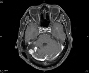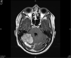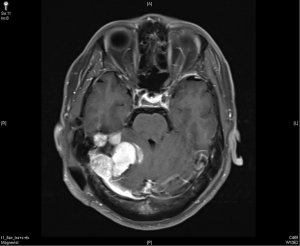 | April 2015 | Recurrent lobulated extra-axial pedunculated tumors over right cerebellar tentorium | Unsteady gait, vertigo |