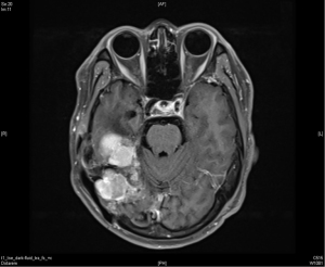 | December 2016 | Enlargement of supratentorial portion of tumor over right cerebellar tentorium | Headache | 6,000 cGy in 30 fractions | Three years |